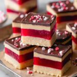 - Set the raspberry jelly layer: Pour the warm raspberry jelly evenly over the cooled shortbread base. Place the pan in the freezer and let it set for 30 minutes.
