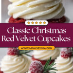 Celebrate the holiday season with these festive Christmas Red Velvet Cupcakes, featuring moist, tender red velvet cake topped with creamy vanilla frosting and adorned with fresh raspberries and rosemary sprigs for a perfect wintry touch.