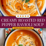 A comforting and flavorful Roasted Red Pepper Ravioli Soup featuring roasted vegetables blended into a rich base, simmered with tender ravioli, and garnished with cream, fresh basil, and optional red pepper flakes for a delightful meal.