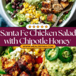 A vibrant and flavorful Santa Fe Salad featuring seasoned grilled chicken, fresh vegetables, quinoa, black beans, and a zesty chipotle honey vinaigrette. This hearty salad combines smoky spices with creamy avocado and crunchy tortilla chips for a delicious and satisfying meal perfect for lunch or dinner.
