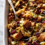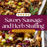 This Sausage & Herb Stuffing recipe is a flavorful, hearty side dish perfect for holiday meals or any special occasion. Featuring toasted bread cubes mixed with savory Italian sausage, fresh herbs, apples, mushrooms, and cranberries, this stuffing balances savory and sweet notes with a moist, tender texture. It can be baked inside a turkey or on its own, and it’s easily adaptable for vegetarians by substituting the sausage with mushrooms or butternut squash and using vegetable broth.