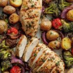 This Sheet Pan Chicken and Veggies recipe offers a simple, wholesome, and flavorful meal with tender roasted chicken breasts and a vibrant mix of seasoned vegetables all cooked together on a single sheet pan. Perfect for an easy weeknight dinner, it features a smoky, herb-infused marinade and a medley of broccoli, red onion, baby potatoes, and cherry tomatoes, garnished with fresh parsley and Parmesan cheese.