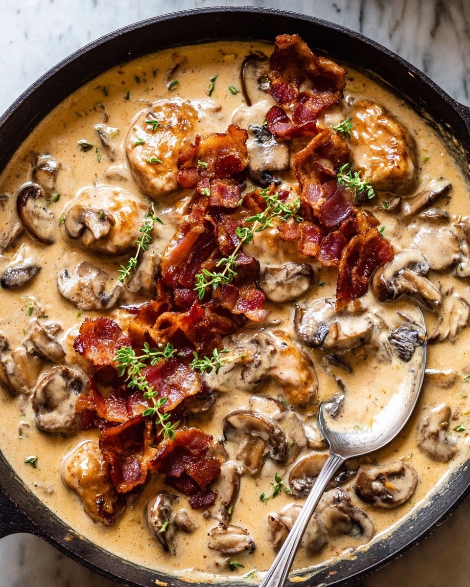 Smothered Chicken in Mushroom Wine Pan Sauce is a rich and comforting dish featuring tender thin-cut chicken breasts seared to golden perfection and simmered in a creamy mushroom and white wine sauce, accented with crispy prosciutto and aromatic herbs. This recipe delivers a perfect balance of earthy mushroom flavors, savory herbs, and a luscious Gruyère cheese topping, making it an ideal dinner to serve with crusty bread for soaking up the delicious sauce.