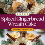 This Spiced Gingerbread Wreath Cake is a cozy holiday dessert featuring warm spices like ginger, cinnamon, cloves, and nutmeg. Baked to perfection in a Bundt pan, it’s topped with fluffy whipped cream frosting and beautifully adorned with festive cinnamon sticks, star anise, candied ginger slices, and fresh rosemary sprigs. This charming cake brings seasonal cheer and comforting flavors to any holiday gathering.