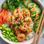 - Assemble Bowls: Start with a base of cooked fluffy rice (or a combination of rice and shredded lettuce). Top with cucumber, jalapeño, shredded carrot, steamed edamame, and the saucy shrimp.