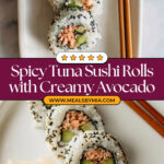 A flavorful and easy-to-make Spicy Tuna Sushi Roll featuring a creamy, spicy tuna filling combined with perfectly seasoned sushi rice, fresh cucumber, and avocado wrapped in seaweed. This homemade sushi is perfect for a delicious and impressive meal or snack.