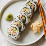 - Assemble the sushi rolls: Cover your bamboo sushi rolling mat with plastic wrap to prevent sticking. On a clean surface, place a nori sheet shiny side down onto the mat. Spread a layer of the seasoned sushi rice evenly over the nori, leaving about one inch clear at the top and bottom edges to seal the roll. Sprinkle white and black sesame seeds evenly over the rice.