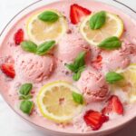 - Garnish and Serve: When ready to serve, gently float the remaining sherbet scoops on top along with sliced strawberries, lemon slices, and fresh basil to garnish. Place 9oz cups or mason jars nearby for guests to serve themselves.