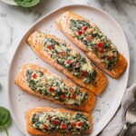 This Stuffed Salmon with Spinach & Feta is a flavorful and healthy dish that combines tender salmon fillets with a savory filling of sautéed spinach, feta cheese, parmesan, and roasted red peppers. Ready in just 30 minutes, it’s perfect for a quick yet impressive weeknight dinner or special occasion meal. The salmon is carefully sliced to create a pocket for the cheesy spinach stuffing, then baked to juicy perfection.