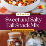 A deliciously addictive Sweet and Salty Fall Snack Mix combining crunchy cereals, pretzels, cheese crackers, and honey nut cereal with a buttery, brown sugar, and maple syrup coating, baked to golden perfection and tossed with festive mini marshmallows, candy corn, and peanut butter candy pieces. Perfect for fall gatherings or anytime snacking.