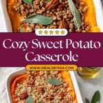 This Sweet Potato Casserole features roasted sweet potatoes pureed and topped with a crunchy, nutty oat and pecan crumble. Infused with warm spices like ginger, thyme, and rosemary, and garnished with fresh sage, this dish is a perfect cozy side for fall and holiday meals. The combination of creamy sweet potato and a crisp, flavorful topping makes it a crowd-pleaser that brings both comfort and elegance to your table.