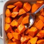 - Toss to Coat: Remove the baking dish carefully from the oven and gently toss the sweet potatoes to coat them evenly in the syrup and melted butter.