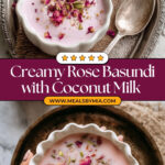 This Delicious Rose Basundi Recipe is a creamy, vegan Indian dessert infused with fragrant rose syrup and delicate spices. Made with coconut milk, vegan creamer, and roasted nuts, this sweet treat is rich and luscious, perfect for special occasions or a flavorful indulgence. Aromatic rose water and edible rose petals add elegance and a floral finish to this traditional favorite.