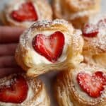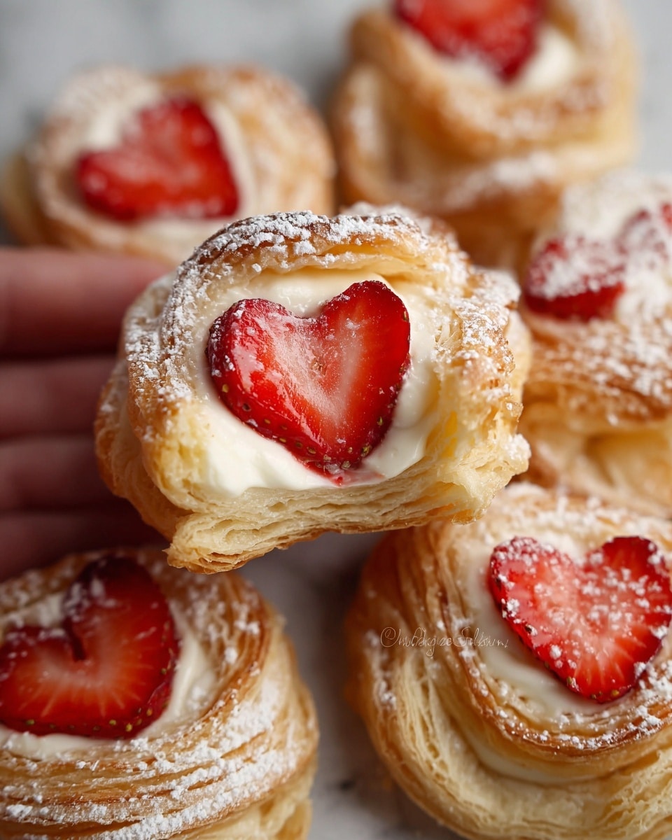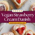 This Vegan Strawberry Cream Danish recipe features flaky, heart-shaped puff pastries filled with a luscious dairy-free cream cheese mixture and topped with fresh strawberry slices. Perfectly golden and lightly sweetened, these delightful pastries are ideal for a vegan-friendly breakfast, brunch, or dessert treat.