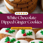 Delight in these festive White Chocolate Dipped Ginger Cookies, featuring a perfect blend of warm spices and rich molasses, baked to a soft finish, then dipped in creamy white chocolate and beautifully decorated with red and green candy melts for a holiday touch.